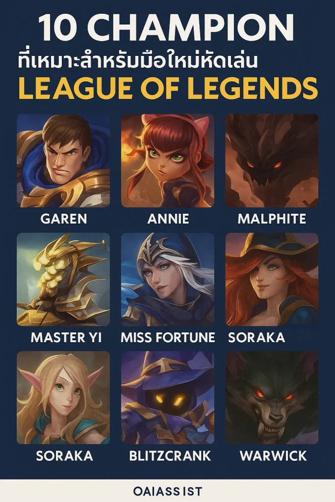 สำหรับมือใหม่ที่หัดเล่น LoL การเลือก Champion ที่เหมาะสมคือจุดเริ่มต้นของการเรียนรู้เกม การเริ่มจาก Garen, Annie, Ashe หรือ Master Yi จะช่วยให้เข้าใจบทบาทของแต่ละเลน และค่อย ๆ พัฒนาฝีมือเพื่อก้าวสู่ระดับสูงขึ้น